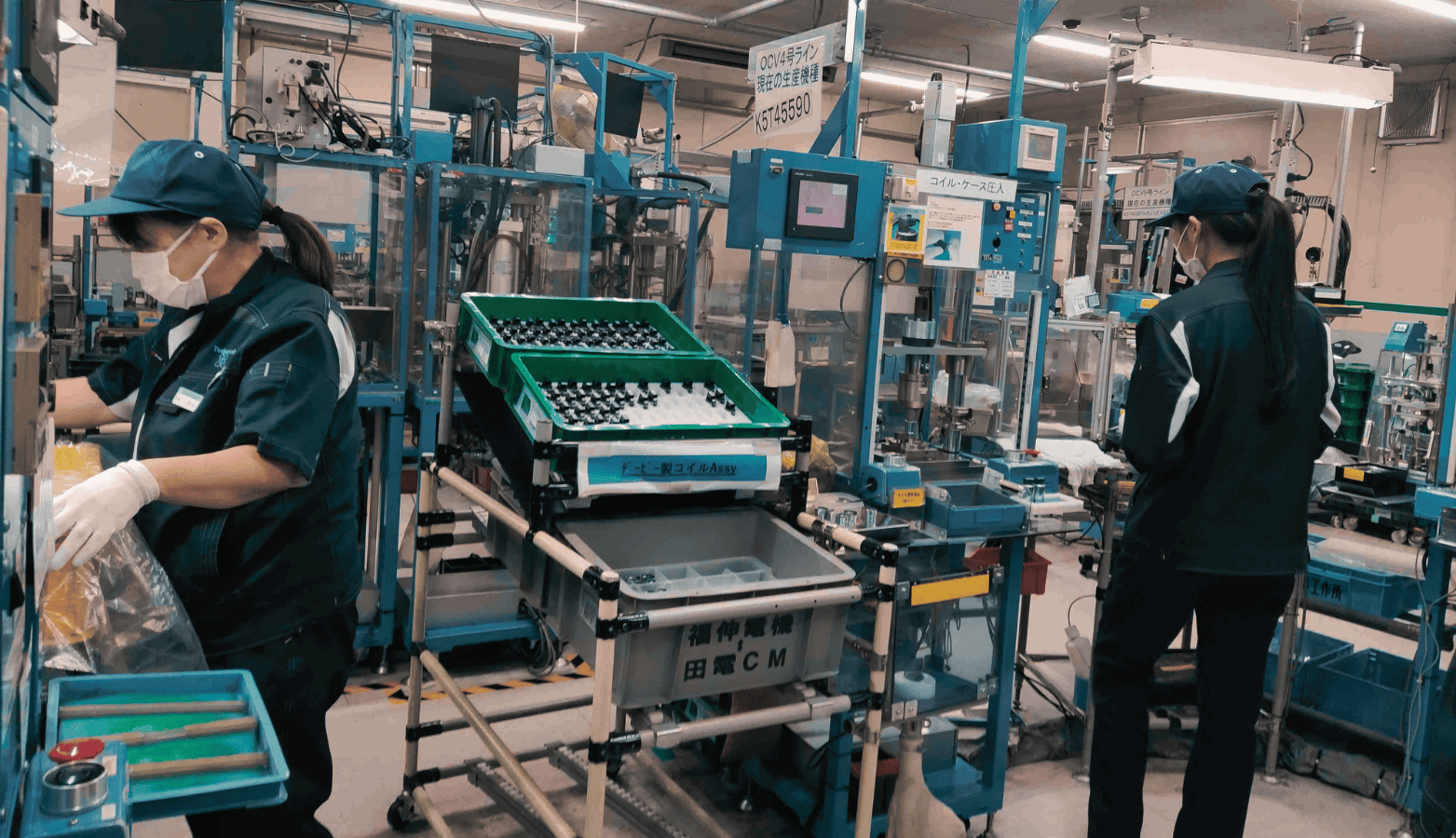 40年余にわたって大手メーカー協力工業として自動車エンジン部品やオーディオ機器の生産を続け、顧客の信頼を得てきました。材料調達、製造ラインの構築、機械設備による合理化ラインやマントラ生産、セル生産、品質保証、出荷まで一貫生産体制を備えています。